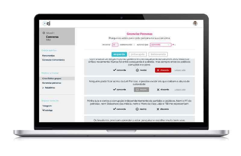 A EJ segue em constante desenvolvimento e, nesse momento, estamos focados em duas frentes de trabalho. A primeira busca ajudar os criadores a engajar os participantes em ações pós-coleta. Isso permitirá que a EJ viabilize estratégias de Advocacy por meio dos grupos de opinião. A segunda é focada na página do participante, permitindo que ele acesse assuntos de interesse e tenha mais controle sobre seus dados (estamos atentos à LGPD). Queremos melhorar a experiencia de quem participa 😊!